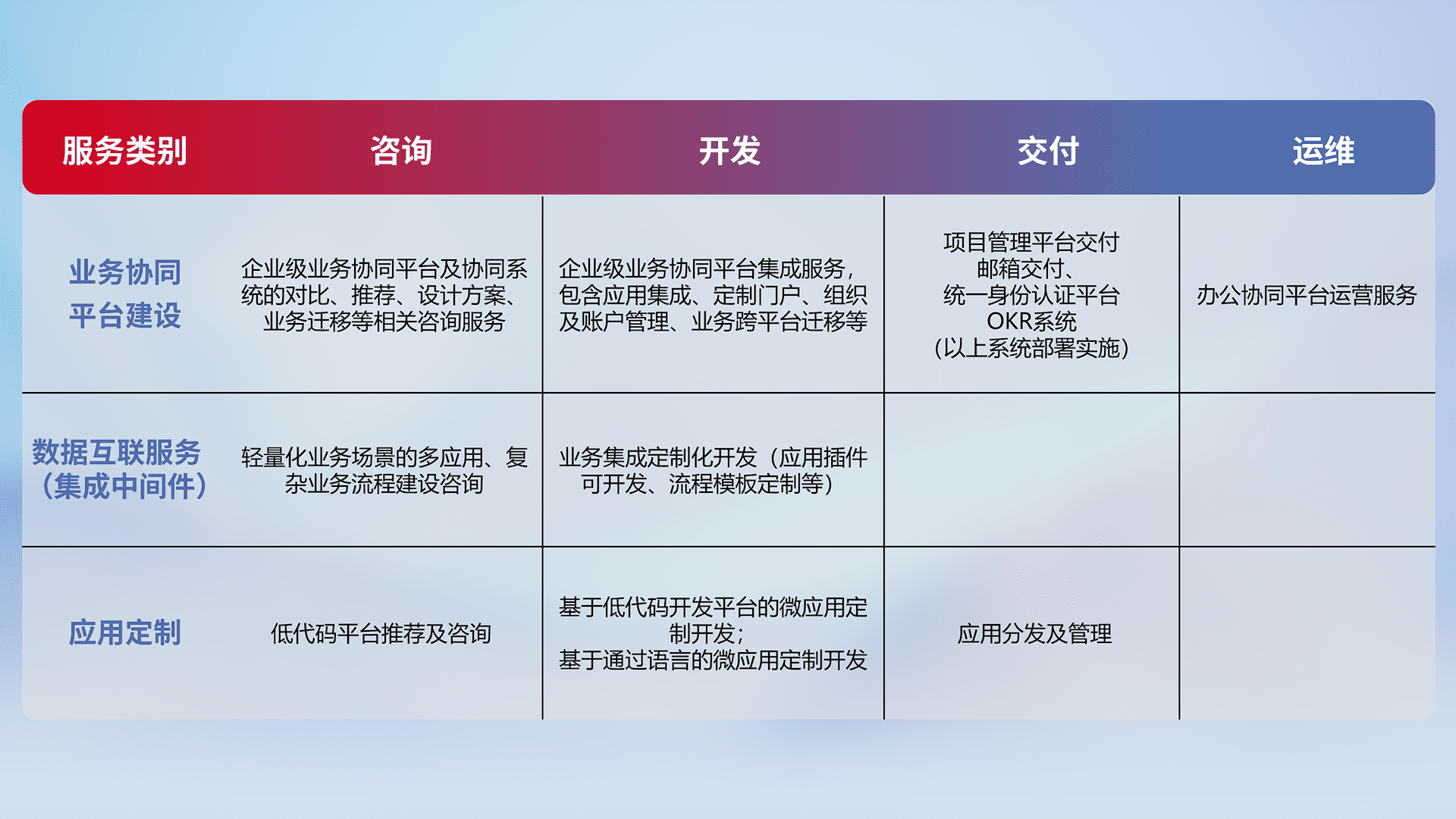 针对钉钉、、、企微、、IDaas等平台级产品提供产品的规划、、方案、、交付、、、、定制化开发等服务,,,,实现如统一协同办公、、、智能客户服务、、、混合会议管理、、、智能数据查询、、等业务场景,,,,实现数字化转型。。。。